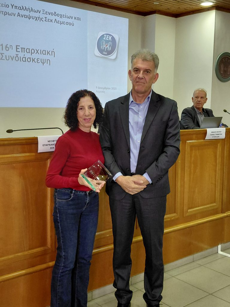 Ιδιαίτερα συγκινητική στιγμή αποτέλεσε η τιμητική βράβευση της συναδέλφου Ρεβέκκας Καλλή Νικολάου, η οποία, μετά την αφυπηρέτησή της και αποχώρησή της από το Δ.Σ., τιμήθηκε για τη μεγάλη και διαχρονική συνεισφορά της στη συνδικαλιστική δράση.